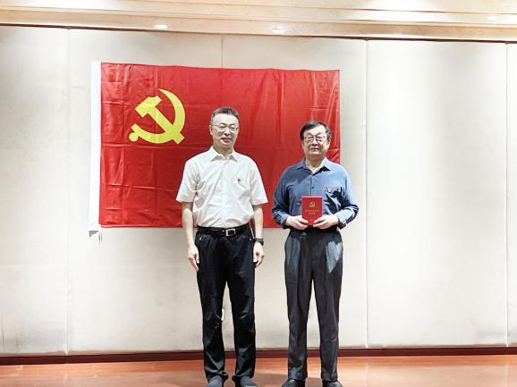 王建东同志代表党总支向井宏伟同志颁发了“光荣在党五十年”纪念章。会上,王建东同志还向全体党员通报了2024年上半年学会党建工作情况。