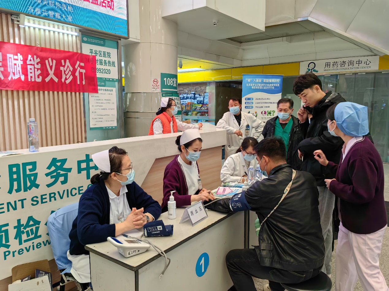 随后,专家团来到平谷区医院门诊楼开展义诊活动,区医院肾内科医护人员率先为到场群众提供免费测血压、并发放慢性肾脏病防治宣传资料。